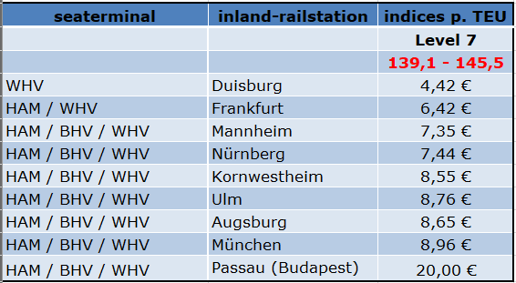 The values are in EUR per TEU and transport direction. The calculation is based on the average index value for the months of May to July 2025.